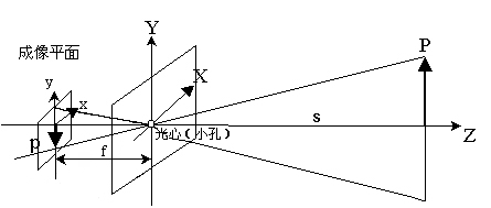 該模型成立的必要條件是光線沿直線傳播,由P點光源發出的光線經過光心后將會在另一面呈現出倒立點p,其中f為焦距,S為光源與光心間的距離。根據三角形相似關系,即可求解相應參數,這就是小孔成像的原理。而攝像機一般是由多組透鏡構成,但基本原理與之相同。該模型確定了現實世界中目標物體的三維圖像與投影平面上的二維圖像之間的映射關系,是后續三維信息恢復與重構的基礎。