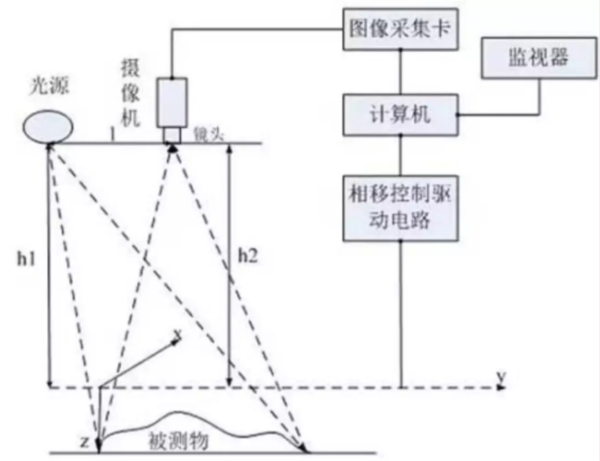 它是基于光學三角原理,根據光源、物體和檢測器三者之間的幾何成像關系,來確定空間物體各點的三維坐標 。