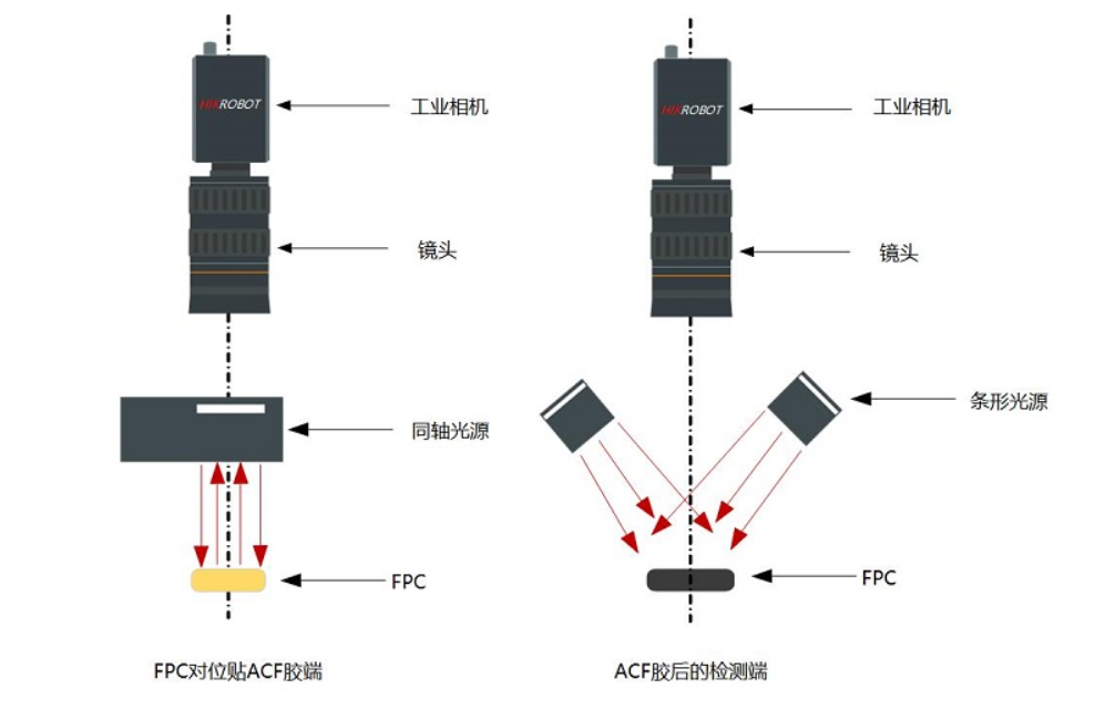 FPC與ACF膠對位貼合的系統方案包括FPC對位貼合ACF膠和貼合后的產品檢測兩部分,這都需要使用海康工業相機來實現。