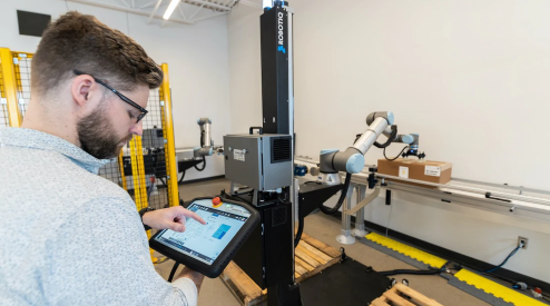 UR機器人公司和Robotiq合作出一個碼垛解決方案??蛻羰盏綑C器人之后,直接在UR機器人的示教器上操作,Robotiq夾爪直接進行工作。Copilot會根據托盤設計并優化所有機器人的行動軌跡,與生產線的吞吐量相匹配。UR機器人和Robotiq夾爪的合作進一步簡化了編程,即使是無經驗的人員也可以很快地操作UR機器人。