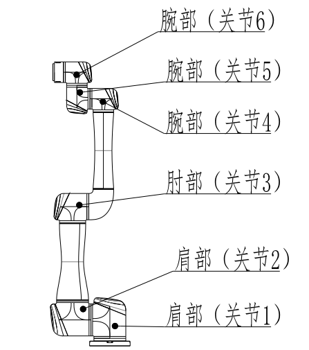 基座?于機(jī)器人本體和底座連接,?具端?于機(jī)器人與?具連接。肩部和肘部之間以及肘部和腕部之間采?臂管連接。通過示教器操作界?或拖動(dòng)示教功能,?戶可以控制各個(gè)關(guān)節(jié)轉(zhuǎn)動(dòng),使機(jī)器人末端?具移動(dòng)到不同的位姿。