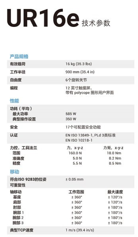 UR16e擁有更高載荷,其半徑為900毫米,重復精度為+/- 0.05毫米。結合這些優勢,UR16e非常適合執行一些高負重的自動化任務,如重型物料處理、重型零件搬運和機床管理。