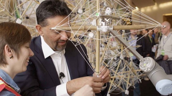 “蜂巢”是一座由生竹子和纖維條建成的建筑,由歐特克大學、斯圖加特計算機設計學院(ICD)、歐特克機器人實驗室和優傲機器人聯合打造而成。旨在使用戶體驗到機器人制造、可穿戴設備、RFID跟蹤和建筑構件嵌入智能設備無縫集成于建筑之中的無窮樂趣。這是一項艱巨的挑戰。