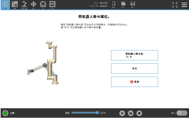 當機器人手臂必須在運行程序之前移動到特定的起始位置時,或者在修改程序時機器人手臂移動到路點時,訪問將機器人移動就位屏幕。