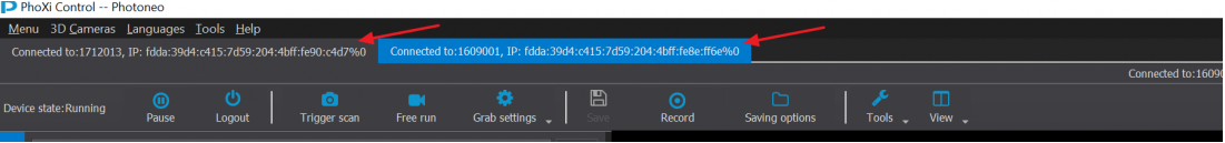 在PhoXi控制中,可以同時連接到兩個掃描儀,并觸發一個接一個的掃描。