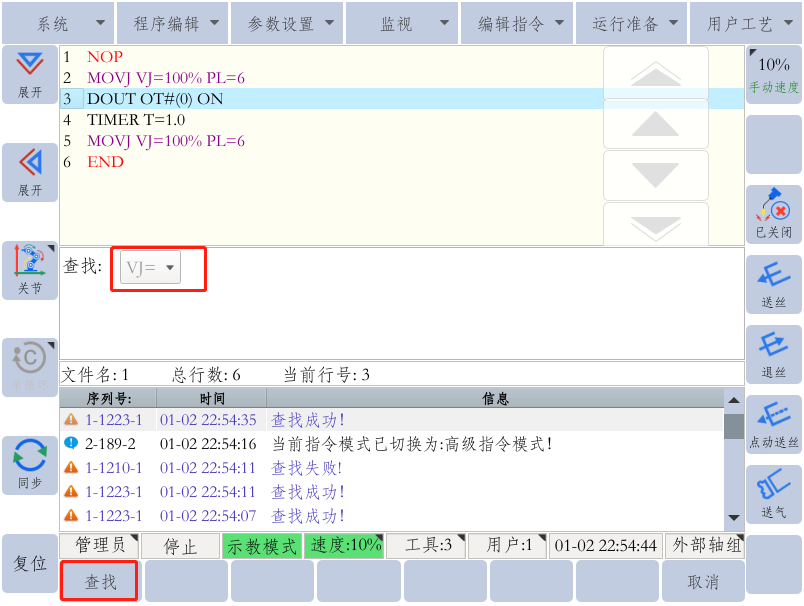 點擊“查找”,彈出查找界?,查找的選項均為各指令的附加項(指令的普通模 式和?級模式顯示的選項數(shù)量不?樣),選擇需要查找的選項,輸?相應(yīng)的數(shù)值后,點擊?菜單欄的“查找”即可在當(dāng)前程序內(nèi)查找符合要求的程序,光標或?動切換到符合要求的程序?。