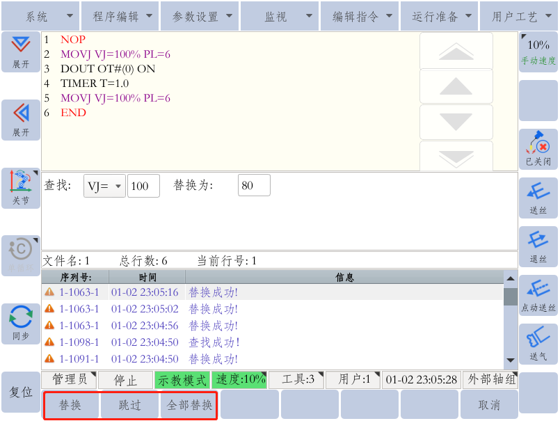 替換功能為替換符合要求的程序語句附加項的數(shù)值,點擊“替換”之后,在?菜單欄會有“替換、跳過、全部替換”三個選項;點擊“替換”會按要求依次查找符合的選項并執(zhí)?替換,?次只執(zhí)??個語句;點擊“跳過”會跳過下?個符合要求的程序語句;點擊“全部替換”會?次將整個程序所有符合要求的程序語句全部替換掉。