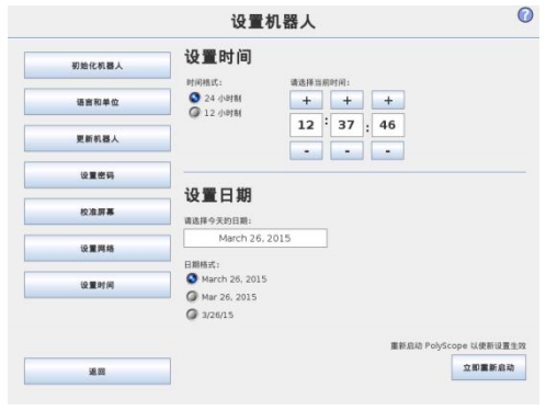 設(shè)置系統(tǒng)的時間和日期,并配置時鐘的顯示格式。時鐘顯示在運行程序和機器人編程屏幕頂部。輕觸時鐘將立即顯示日期。必須重新啟動 GUI,所做更改方可生效。