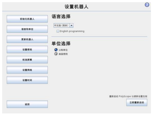 PolyScope 中使用的語言和單位可以在該屏幕設(shè)定。PolyScope 上不同屏幕顯示的文本都將以選定的語言顯示,內(nèi)嵌的幫助文件也將以選定的語言顯示。勾選 “英文編程”,以英文顯示機器人程序內(nèi)的命令名稱。PolyScope 必須重新啟動,所做更改方可生效。