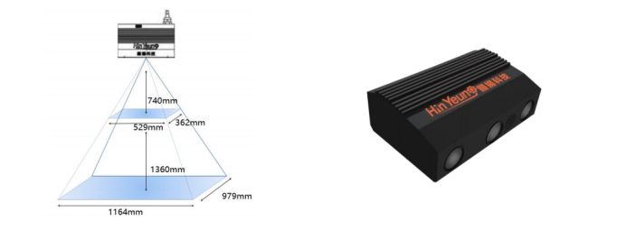 該解決方案包括三維視覺系統、機械臂和夾具、智能控制系統。三維視覺系統選用的是顯揚科技HY-M5三維視覺系統,該系統成像快、精度高,HY-M5掃描速度為10-300Hz,掃描精度能精確至±0.01mm,配合自研智能算法,可以快速掃描和獲取紙箱的尺寸、形狀、堆碼高度等信息,實現對紙箱的精準識別和定位。
