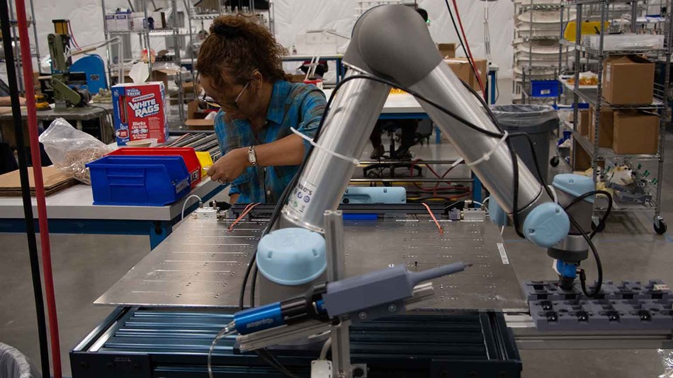在注塑部門,一臺UR5機器人的工作內容是完成復雜的塑料擠出裝配,拾起塑料板的端蓋,并將這些端蓋移過點膠機。在端蓋中正確點膠后,UR5會將零件放置在工作臺的執行器中,然后零件會被夾具夾緊。然后,操作員會接過零件,檢查粘合情況,并移出零件。放在以前,這項任務需要四名操作員合力完成,日均產能大約為200個。現在,只要一名操作員與一臺UR5協作式機器人就能實現自動化生產,日均產能可升至400個,廢品率可從15%降至3%。