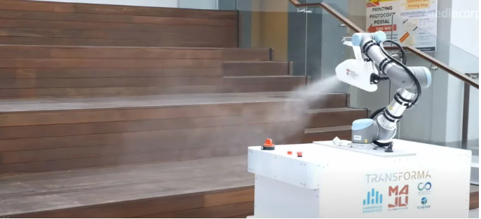 4月中旬,南洋理工大學(NTU)的研究人員為解決這一問題,推出eXtremeDisinfectionroBOT(XDBOT),它由一個裝有靜電噴嘴的UR5協作式機器人組成,安裝在一個移動平臺上。