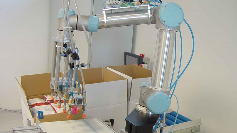 優(yōu)傲機(jī)器人安置在充填封口機(jī)的傳送帶前面,以拾取掉落到傳送帶上剛袋裝的產(chǎn)品。為了實(shí)現(xiàn)持續(xù)的工藝流程,還開發(fā)了抓取工具,工具上裝有五組雙吸盤部件。這十分適合提起表面光滑且柔軟的袋子。