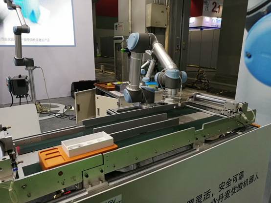 在該應用中,物料隨著托盤一起運行,在運行過程中,當托盤傳感器感應到托盤經過時,將信號傳送給UR機器人,通過編碼器的實時速度反饋,UR機器人跟隨物料一起運行,并向下吸取物料,隨后將物料進行跟隨入盒,完成后回到原點位置,等待下一次循環。