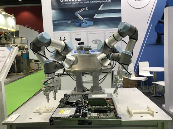 在該應用中使用UR雙臂機器人,其中一個手臂安裝服務器CPU,同時另外一個手臂安裝風扇。完成后,雙臂協同裝配內存條。UR雙臂機器人的兩個手臂,既可以單獨運行,也可以協同工作。