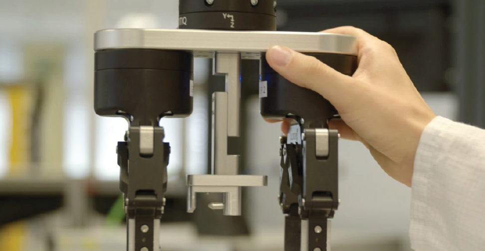 整個質量測試應用程序均由人機界面控制,獨立于Universal Robots示教器。 機器人首先接收到信號,以便同時使用兩個Robotiq 2F-85自適應抓爪來管理計算機。 然后,機器人將讀取計算機的條形碼。 Robotiq FT 300可幫助放置計算機以讀取條形碼。 完成此操作后,將計算機放置在質量測試單元中。 Grippers / FT 300組合每次都能確保完全相同的定位。 然后組合桿關閉杠桿,測試階段開始。 測試完成后,除條形碼讀取外,將反向執行相同的過程。