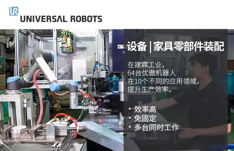 在建霖工業(yè),應(yīng)用了64臺(tái)UR協(xié)作機(jī)器人在10個(gè)不同的產(chǎn)線上,提升了生產(chǎn)效率。