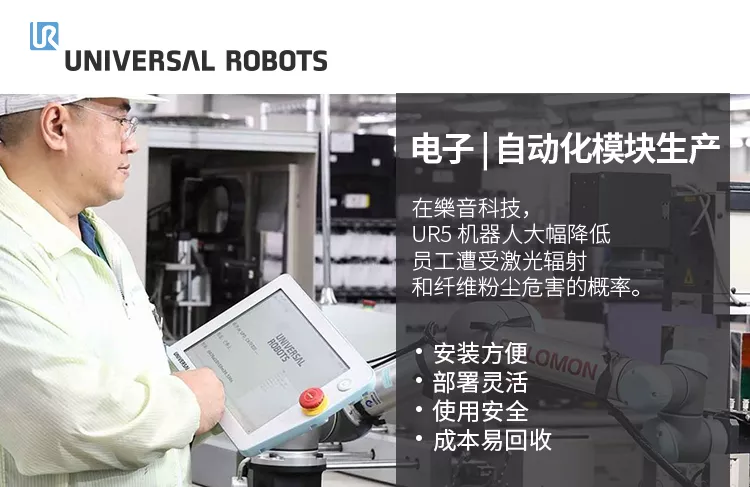 UR5協(xié)作機(jī)器人降低了電子行業(yè)受激光輻射貨物纖維粉塵危害的概率。