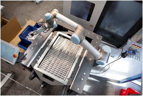在過去,員工必須在CNC機器中一次手動插入四個零件,等待90秒,然后在工作日期間重復該過程。現在,該解決方案僅需五分鐘即可手動填充ProFeeder的兩個搬運工。當優傲機器人清空了其中一個動子的零件托盤時,操作員將空動子移開并將填充的動子單擊到ProFeeder中,使CNC快速恢復操作。
