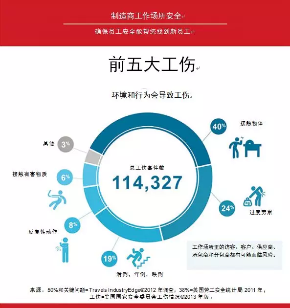 2017年,因工傷和死亡而造成缺勤的天數為1.04億天。此外,美國公司每年還要為職工賠償保險支付950億美元。將這些國家數據歸結到個人事件,美國國家安全委員會估計,2017年工傷的平均直接和間接成本為39,000美元,工作相關死亡事件的平均成本為115萬美元。這些數字加起來得出一個結論,即勞動力短缺限制了能找到的技術工人:工傷對制造商財務和運營方面均造成了巨大損失。
