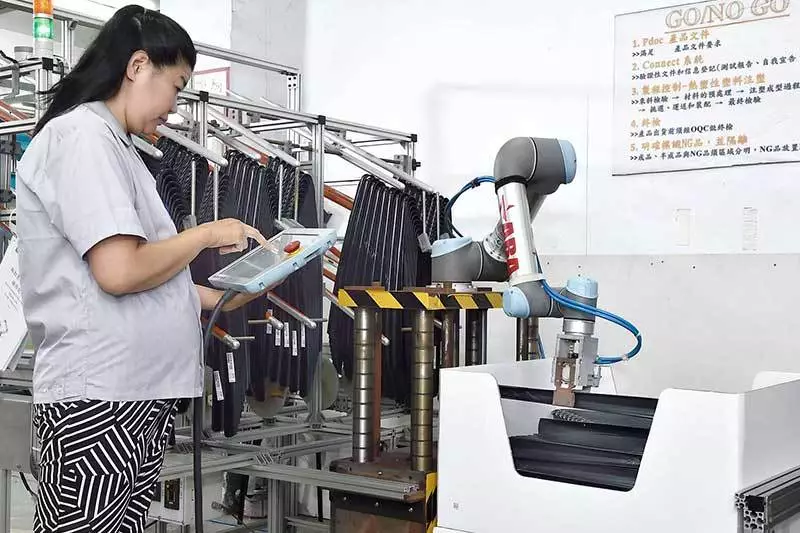 在臺灣注塑商BTC Mold,UR協作式機器人降低了較低級的職業危害風險,為員工創造了更友好、更安全的工作場所。以前,工人須一直彎著腰對鞋拔子進行裝盒,從人體工程學上來說,這是對人體不友好的任務之一,目前已由協作式機器人接手。