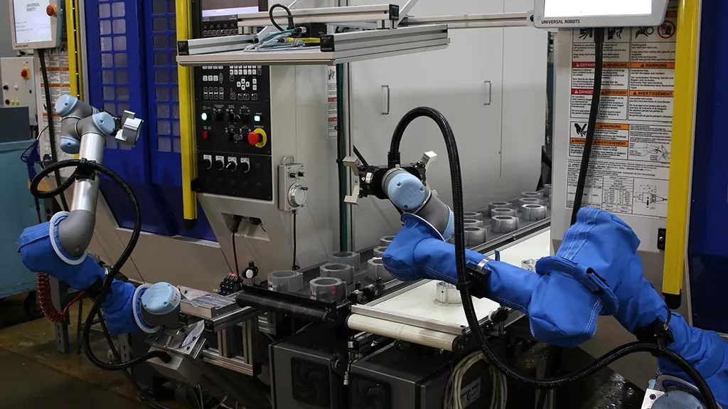 他們了解到協(xié)作機器人十分靈活,方便移動到不同的產(chǎn)線上。于是安裝了一臺UR10機器人和兩臺UR5機器人用來照管機床;第四臺UR5安裝在帶車輪的移動工作臺上,負責在各任務間靈活調(diào)度。
