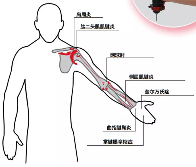 作業員長期受到擰緊槍的自重和反作用力的影響,導致肌腱損傷,而患上左圖所示的職業病。