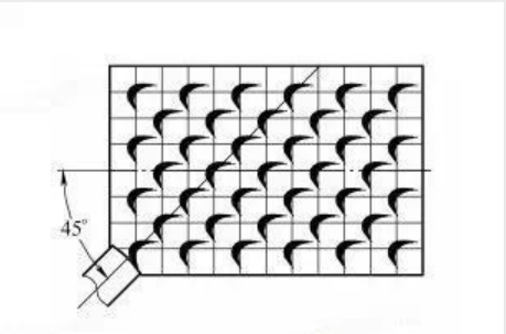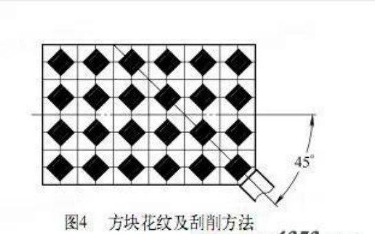 方塊花紋如圖4所示。刮花前要在工件表面用鉛筆劃出一定間距的方格。刮花時(shí),刀身平面中心線與工件表面縱向中心線成45°角,從工件的前面向后面進(jìn)行刮削?;竟畏ㄊ牵翰捎弥本€刃(或大半徑圓弧刃)窄刮刀進(jìn)行短程推刮,刮出第一個(gè)方塊后,應(yīng)間隔一個(gè)方塊距離即空出一格再刮出第二個(gè)方塊。