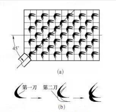 (2)燕子花紋及刮法 燕子花紋如圖3a所示。刮花前要在工件表面用鉛筆劃出一定間距的方格。刮花時(shí)采用圓弧刃精刮刀,刀身平面中心線與工件表面縱向中心線成45°角,從工件的前面向后面進(jìn)行刮削。常見(jiàn)的刮法是: