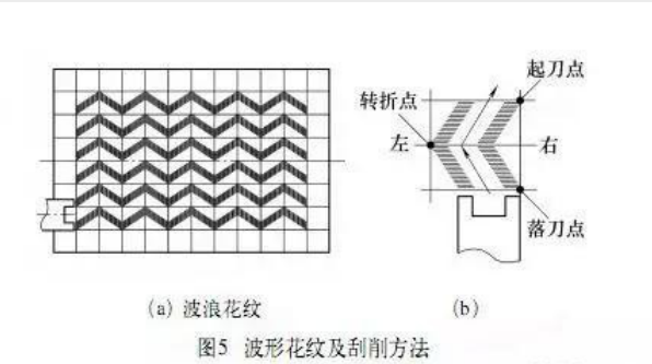 波浪花紋如圖5a所示。刮花前要在工件表面用鉛筆劃出一定間距的方格。刮花時(shí),刀身平面中心線要平行于工件表面縱向中心線,從工件的后面向前面進(jìn)行刮削?;竟畏ㄊ牵翰捎没砜诠蔚哆M(jìn)行刮削,選擇好落刀位置(一般選擇交點(diǎn)處),落刀后即向左側(cè)斜向移動(dòng)推刮,當(dāng)達(dá)到一定長(zhǎng)度時(shí)(一般選擇交點(diǎn)處)緊接著向右側(cè)斜向移動(dòng)推刮至一定位置后起刀,如圖5b所示。