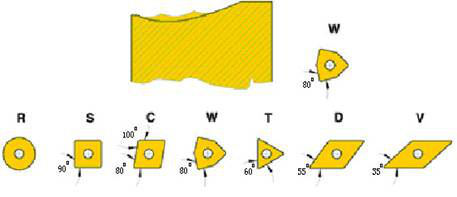 刀片形狀主要依據(jù)被加工工件的表面形狀、切削方法、刀具壽命和刀片的轉(zhuǎn)位次數(shù)等因素選擇。