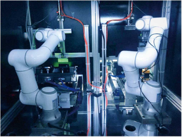 兩臺(tái)EC63桌面式協(xié)作機(jī)器人及顯揚(yáng)科技的3D視覺(jué)設(shè)備應(yīng)用于末端檢測(cè)工位,左側(cè)機(jī)器人執(zhí) 行按鍵檢測(cè),右側(cè)機(jī)器人負(fù)責(zé)觸摸屏的觸控檢測(cè),顯揚(yáng)科技的3D視覺(jué)設(shè)備拍攝被測(cè)物體,滿(mǎn)足客戶(hù)對(duì)X、Y、Z方向測(cè)量或定位等高分辨率畫(huà)面輸出的需求。協(xié)作機(jī)器人特別 適合狹小空間自動(dòng)化改造,符合曲面屏或雙面屏檢測(cè)要求。